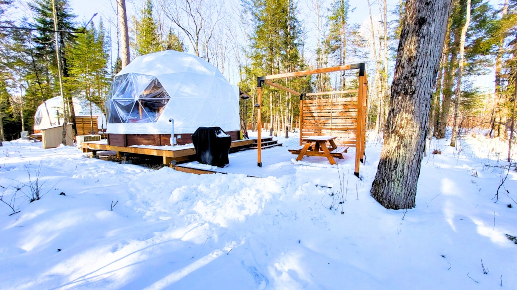 The dome is designed for all four seasons and available 12 months a year. Live an unforgettable experience in nature under the stars thanks to the dome's large windows. You will also find all the amenities for your comfort such as a kitchen with electricity, internet, pellet stove and air conditioning for warmer days. It sleeps 3 to 4 people, and is equipped with a queen-size bed and a double sofa bed, as well as a compostable toilet.